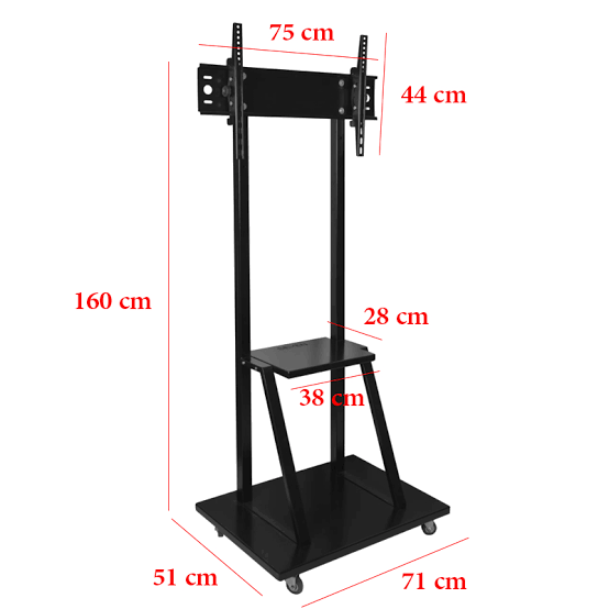 پایه ایستاده چرخدار ،متحرک و دارای شلف شیشه ای ،مناسب ۴۳ تا ۷۵ اینچ ، ورق ضخیم